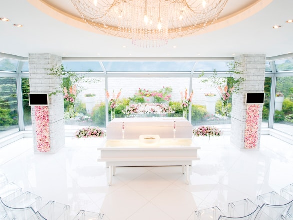 葬儀を取り行う際に葬儀式場の設置するための壇になります。当社では白木祭壇の他、生花祭壇やラウンド型祭壇も採用しております。